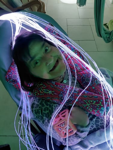 Le lendemain nous faisons une activité sensorielle à Bourgneuf-en-Retz. Claire a crée un espace snoezelen, c'est à dire une pièce propice à la détente, éclairée d'une lumière tamisée et bercée d'une musique douce. L'idée est que chacun puisse explorer ses sens en évoluant dans un espace sécurisant, où chaque élément est en libre accès et peut éveiller la curiosité ou apporter un moment relaxant.
